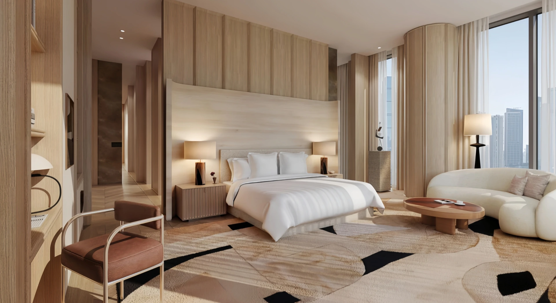 The exact composition of a hotel furniture list varies based on hotel brand standards, room type, and target market. Standard guest rooms typically focus on the bedroom area, while suites and luxury rooms require additional living, dining, and storage zones. For this reason, hotel projects plan furniture by functional areas rather than individual items.