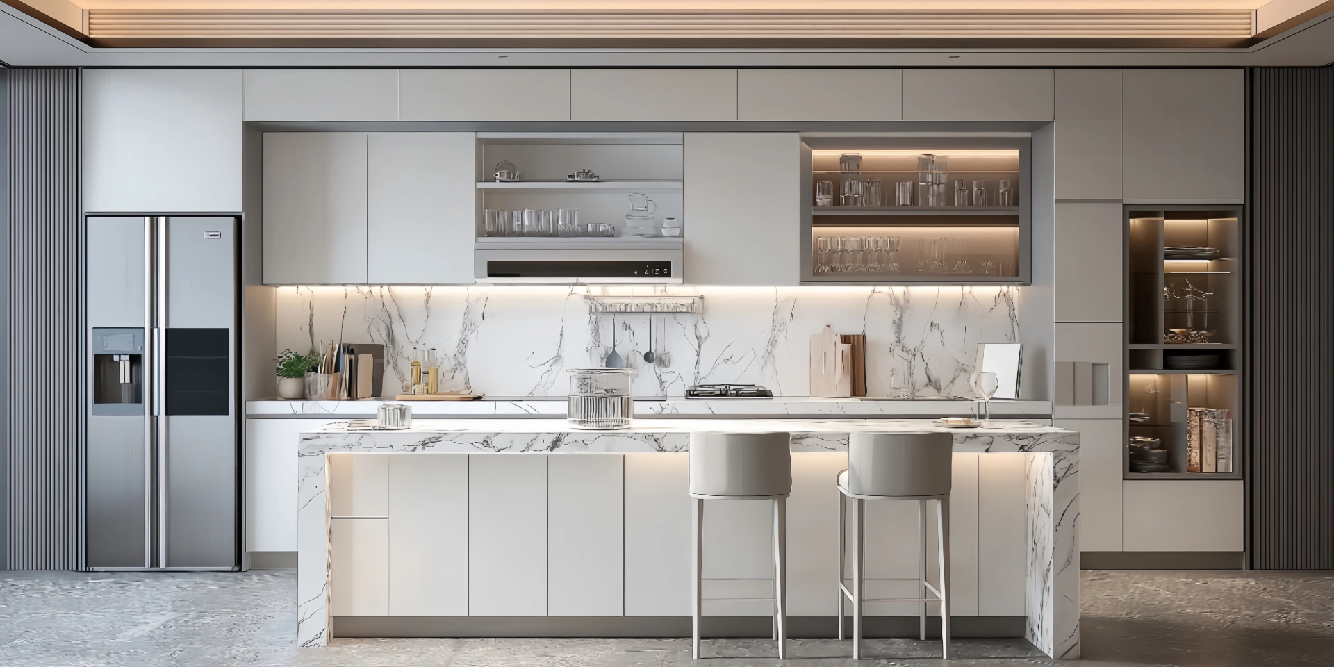 White PVC Kitchen Cabinets with Marble Island – Modern Luxury Design
